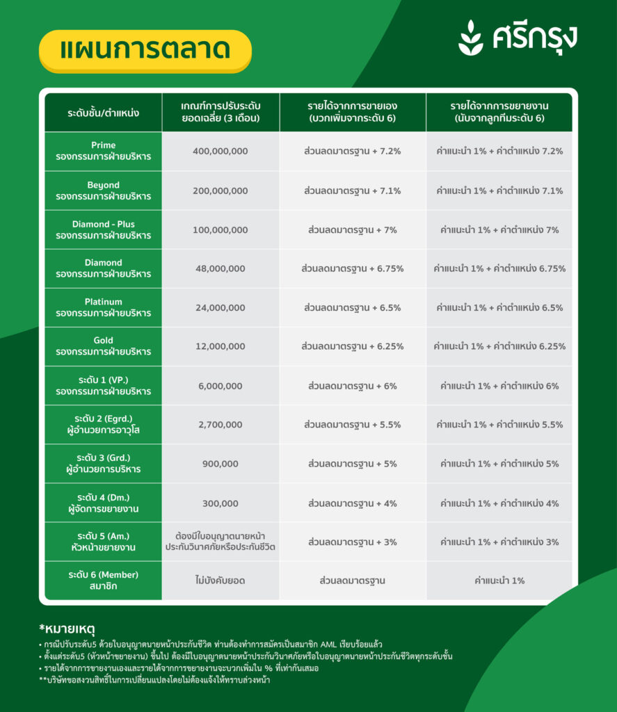 รับรายได้เพิ่มจากค่าบริหารสายงาน เมื่อมีบัตรนายหน้า 3% – 7.2% ทุกเดือน จากยอดการซื้อขายของทีมงานในทุกระดับชั้น เป็นรายได้แบบ Passive Income แม้เจ็บป่วยหรือหยุดทำ แต่รายได้ไม่หยุด เมื่อปรับระดับขึ้นแล้ว ไม่ลดตำแหน่ง ไม่ต้องรักษายอด นอกจากนี้ยังสามารถส่งต่อเป็นมรดกให้ทายาทได้ในตำแหน่งที่สร้างไว้ นี่คือจุดเด่นของแผน MGM ของบริษัท ศรีกรุงโบรคเกอร์ จำกัด