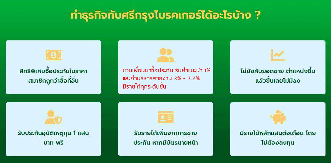 นายหน้าขายประกันภัยถือว่าเป็นอาชีพที่สร้างรายได้ที่ดี สามารถเริ่มต้นขายประกันภัยรถยนต์ได้ง่าย ใช้เงินลงทุนต่ำ ภายใต้การดูแลของ บริษัท ศรีกรุงโบรคเกอร์ จำกัด ซึ่งบริษัทเปิดดำเนินงานด้านธุรกิจประกันวินาศภัยมายาวนานมากกว่า 30 ปี มีสาขาให้บริการลูกค้า และสมาชิกกว่า 40 สาขาทั่วประเทศ บริษัทศรีกรุงโบรคเกอร์ได้ก้าวสู่การเป็นผู้นำด้านประกันภัยระดับต้นๆของโบรคเกอร์ประกันภัย ปัจจุบันมีเบี้ยประกันภัยรวมกว่า 3,000 ล้านบาท โดยยึดหลักในการบริหารงานภายใต้สโลแกน ” เบี้ยถูก คุ้มครองดี บริการเยี่ยม “